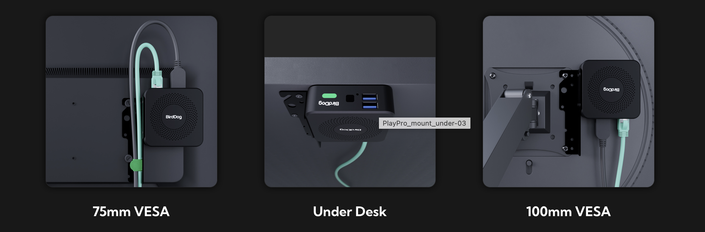 PLAY Pro è progettato per essere utilizzato in ambienti professionali. Il suo robusto involucro metallico, combinato con un supporto VESA incluso, consente di installarlo in modo sicuro dietro un display, all'interno di un mobile AV, sotto una scrivania, in qualsiasi orientamento.