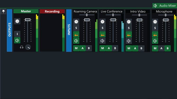 Audio Mixer ti consente di tenere facilmente traccia di tutte le fonti audio e include la possibilità di silenziare, seguire (mixaggio automatico) e ritardare qualsiasi fonte.